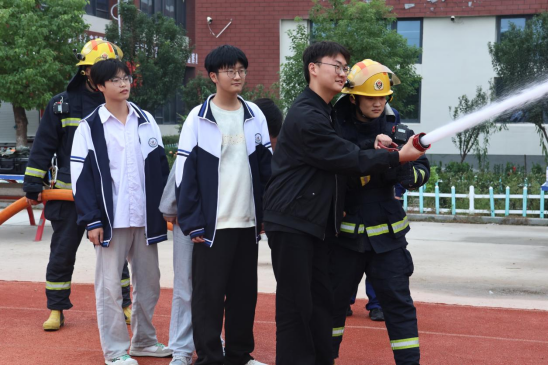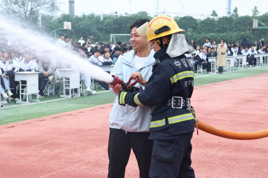 最激动人心的环节当属消防水枪射水体验。在消防员的保护与协助下,几名幸运的学生和老师代表手握沉重的水枪,体验了一把当“消防员”的感觉。当强有力的水柱喷涌而出,精准射向目标时,操场上响起了热烈的欢呼声,将整个活动推向了高潮。