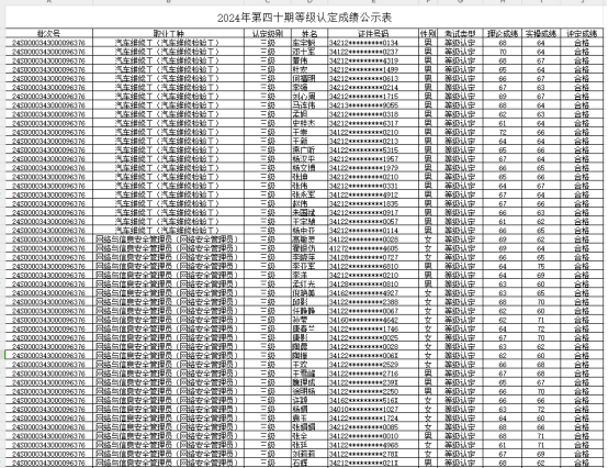 按照有关规定,我校于2024年6月6日组织了汽车维修工(汽车维修检验工)三级,网络与信息安全管理员(网络安全管理员)三级,计算机维修工(三级)技能评价(批号:24S0000343000096376)。通过本次评价,共有66人参加此次考试,66人考核成绩合格(理论知识考试及技能操作均及格),现将评价结果予以公示如下,公示期限3个工作日。