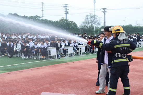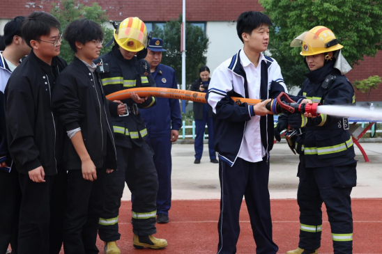 最激动人心的环节当属消防水枪射水体验。在消防员的保护与协助下,几名幸运的学生和老师代表手握沉重的水枪,体验了一把当“消防员”的感觉。当强有力的水柱喷涌而出,精准射向目标时,操场上响起了热烈的欢呼声,将整个活动推向了高潮。