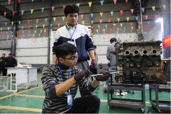 汽车维修专业的选手们围站实训车辆旁,专注排查故障、调试部件,以过硬技术展现汽修领域的专业能力;