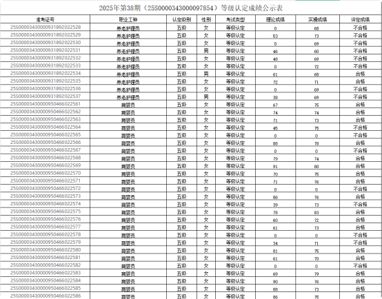按照有关规定,我校于2025年10月31日—11月2日组织养老护理员(三级)育婴员(五级)互联网营销师(直播销售员)五级 技能评价批号:(25S0000343000097854)。通过本次评价,共有68人参加此次考试,46人考核成绩合格(理论知识考试及技能操作均及格),现将评价结果予以公示如下,公示期限3个工作日。